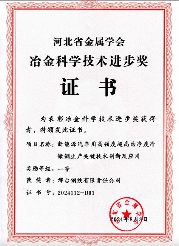 2024年8月8日,邢鋼《新能源汽車用高強度超高潔凈度冷鐓鋼生產(chǎn)關(guān)鍵技術(shù)創(chuàng)新及應用》項目榮獲河北省冶金科學技術(shù)進步獎一等獎。