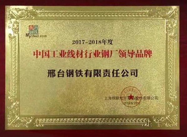 2018年10月22日,在上海舉辦的“2018年Mysteel中國(guó)工業(yè)線(xiàn)材暨緊固件產(chǎn)業(yè)鏈高峰論壇”上,論壇評(píng)委會(huì)根據(jù)對(duì)國(guó)內(nèi)工業(yè)線(xiàn)材生產(chǎn)鋼廠2017-2018年品牌、質(zhì)量和市場(chǎng)反饋等評(píng)比,評(píng)選出“中國(guó)工業(yè)線(xiàn)材行業(yè)鋼廠領(lǐng)導(dǎo)品牌”,邢鋼獲此殊榮。