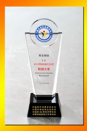 2011年6月17日,由中國外商投資企業(yè)協(xié)會、中國保護(hù)消費(fèi)者基金會、中國民(私)營經(jīng)濟(jì)研究會、中國環(huán)境新聞工作者協(xié)會和北京市石景山區(qū)人民政府聯(lián)合主辦的“第三屆企業(yè)社會責(zé)任年會”在北京舉行。本次年會主題為“企業(yè)的責(zé)任戰(zhàn)略與創(chuàng)新”。年會上隆重揭曉“2011(第三屆)中國企業(yè)社會責(zé)任榜單”。邢鋼公司經(jīng)過嚴(yán)格審核,入選“中國企業(yè)社會責(zé)任榜100強(qiáng)”,并獲“2011中國企業(yè)社會責(zé)任特別大獎(jiǎng)”,授予邢鋼董事長袁世臻 “中國履行社會責(zé)任優(yōu)秀企業(yè)家”稱號。