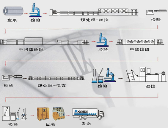 Ф5.5mm 盤條→預(yù)處理→粗拉→中絲熱處理(奧氏體化→索氏體化)→表面處理→中拉→成品前熱處理(奧氏體化→索氏體化)→表面處理→電鍍→熱擴(kuò)散→濕拉→檢驗(yàn)→包裝入庫。