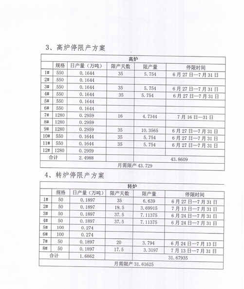 2、132平米燒結機、14平米豎爐、轉爐和白灰窯限產(chǎn)50%。6月25日0時—7月14日0時停產(chǎn),7月14日0時—7月31日正常生產(chǎn),共停機19天。