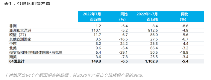2022年7月全球64個納入世界鋼鐵協(xié)會統(tǒng)計國家的粗鋼產(chǎn)量為1.493億噸,同比下降6.5%。