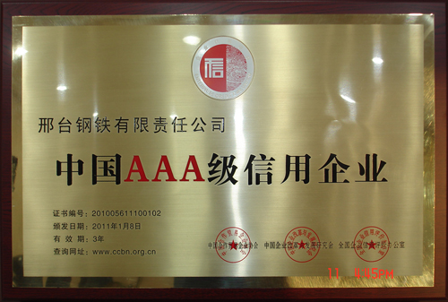 日前,在由中國合作貿易企業(yè)協(xié)會、中國企業(yè)改革與發(fā)展研究會、全國企業(yè)信用評價辦公室組織召開的中國企業(yè)科學發(fā)展論壇暨誠信表彰大會上,邢鋼被評為2010年度“中國AAA級信用企業(yè)”、公司榮獲“全國文明誠信示范單位” 稱號、董事長、總經理袁世臻榮獲“全國優(yōu)秀誠信企業(yè)家” 稱號。
