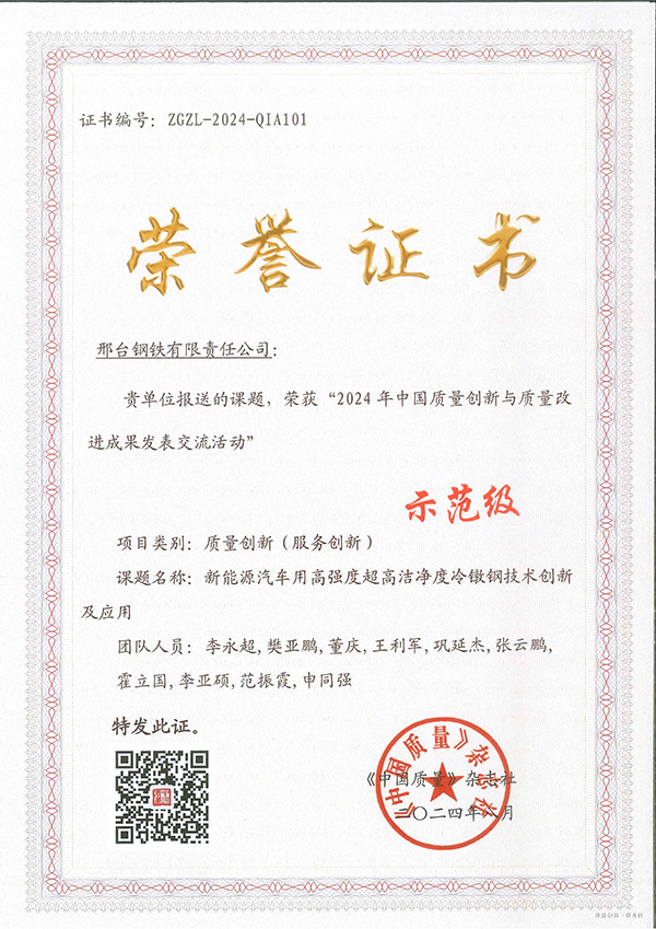 2024年8月,邢鋼《新能源汽車用高強度超高潔凈度冷鐓鋼技術(shù)創(chuàng)新及應用》課題榮獲“2024年中國質(zhì)量創(chuàng)新與質(zhì)量改進成果發(fā)表交流活動”最高級別的“示范級”榮譽。