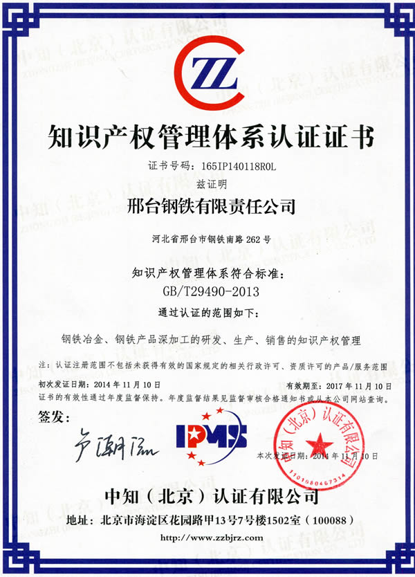 2014年11月10日,邢鋼通過GB/T29490-2013認(rèn)證,中知(北京)認(rèn)證有限公司向邢鋼頒發(fā)了《知識(shí)產(chǎn)權(quán)管理體系認(rèn)證證書》。