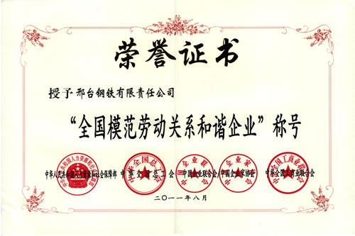 2011年8月,邢鋼榮獲由人力資源和社會(huì)保障部、全國總工會(huì)、中國企業(yè)聯(lián)合會(huì)、全國工商聯(lián)頒發(fā)的“全國模范勞動(dòng)關(guān)系和諧企業(yè)”榮譽(yù)稱號(hào)。