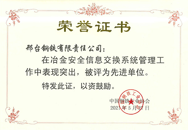 2022年1月,邢鋼被河北省應(yīng)急管理與安全生產(chǎn)協(xié)會評為“2021年度應(yīng)急管理與安全生產(chǎn)先進(jìn)單位”。