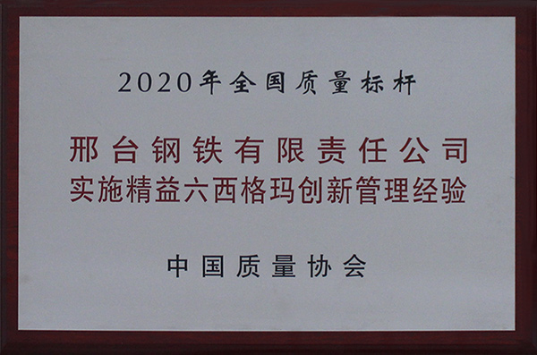 2020年10月21日,由中國(guó)質(zhì)量協(xié)會(huì)主辦,山西省工業(yè)和信息化廳、太原市人民政府承辦的“2020年全國(guó)質(zhì)量標(biāo)桿山西行交流活動(dòng)”在山西省太原市舉辦,在本次交流活動(dòng)上邢鋼《實(shí)施精益六西格瑪創(chuàng)新管理經(jīng)驗(yàn)》被授予“2020年全國(guó)質(zhì)量標(biāo)桿”。