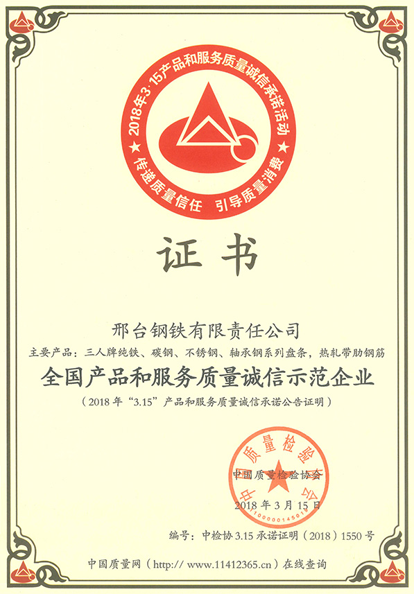 2018年3月15日,邢鋼(主要產(chǎn)品:三人牌純鐵、碳鋼、不銹鋼、軸承鋼系列盤(pán)條和熱軋帶肋鋼筋),被中國(guó)質(zhì)量檢驗(yàn)協(xié)會(huì)授予“全國(guó)產(chǎn)品和服務(wù)質(zhì)量誠(chéng)信示范企業(yè)”稱(chēng)號(hào)。