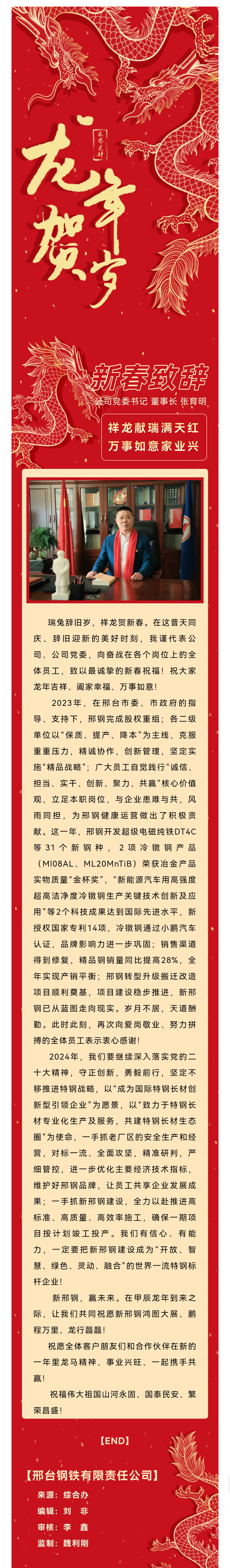 新征程,新起點(diǎn);新目標(biāo),新畫卷。1月31日,以“新邢鋼,贏未來”為主題的公司2024年新春聯(lián)歡會在會議中心隆重舉辦。黨委書記、董事長張育明攜公司全體中高層領(lǐng)導(dǎo)與2023年受表彰的先進(jìn)個人、員工代表歡聚一堂,共話邢鋼大業(yè),喜迎龍年新春。