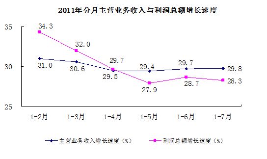2011年分月主營(yíng)業(yè)務(wù)收入與利潤(rùn)總額增長(zhǎng)速度統(tǒng)計(jì)圖。(國家統(tǒng)計(jì)局)