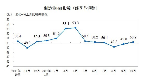 2012年10月,中國(guó)制造業(yè)采購(gòu)經(jīng)理指數(shù)(PMI)為50.2%,比上月上升0.4個(gè)百分點(diǎn),重新回到臨界點(diǎn)之上。