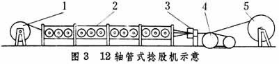 卷線:將鋼絲線盤,重新卷在捻股機的工字輪上;也可將鋼絲從拔絲機后直接卷到工字輪上;捻股:將鋼絲捻成繩股。捻股機有筐籃式、軸管式、無管式和雙捻機等。圖3為12軸管式捻股機示意圖,1是裝下層繩股的工字輪,2是旋轉的機筒,內(nèi)裝12個卷滿鋼絲的工字輪,3是成股的壓線瓦,4是牽引輪,5是上層繩股的收線輪,機筒旋轉一周,牽引輪引出的繩股長度即為股的捻距。