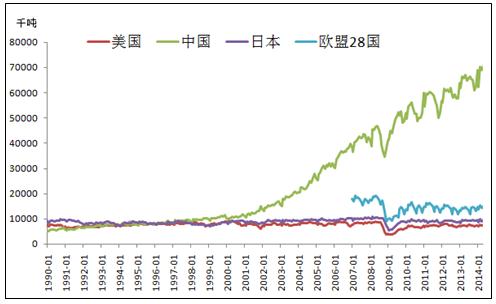 中國是鋼鐵生產(chǎn)大國,粗鋼產(chǎn)量在全球遙遙領(lǐng)先。自2002年開始中國開始進(jìn)入經(jīng)濟(jì)飛速發(fā)展時(shí)期,粗鋼產(chǎn)量一直保持高速增長,到2013年粗鋼產(chǎn)量已達(dá)7.7億噸,約占全球產(chǎn)量的49.1%。美國,日本等鋼鐵生產(chǎn)大國,其對鋼鐵的需求已經(jīng)放緩,粗鋼產(chǎn)量一直保持穩(wěn)定狀態(tài),所以粗鋼產(chǎn)量的增長大部分來自于中國。(見圖1)