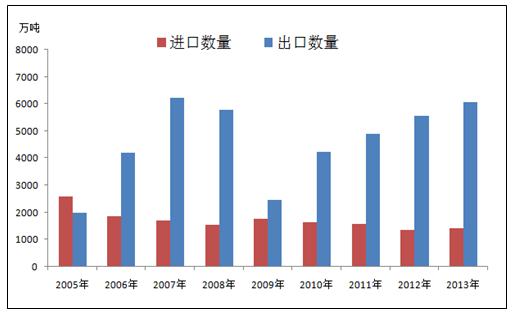 近幾年,中國鋼鐵的進(jìn)口很穩(wěn)定波動(dòng)不大,出口處于穩(wěn)健增長狀態(tài)。出口量增加的原因一是因?yàn)榻?jīng)濟(jì)危機(jī)后各國經(jīng)濟(jì)都在緩慢復(fù)蘇中,主要經(jīng)濟(jì)體制造業(yè)景氣表現(xiàn)出現(xiàn)回升,2014年上半年全球制造業(yè)PMI指數(shù)平均值為52.58,達(dá)到了近兩年來相對高位的水平。另外新興經(jīng)濟(jì)體對國家基礎(chǔ)設(shè)施建設(shè)和民用建筑的投資不斷增大,對鋼材的需求明顯增加;二是中國鋼材價(jià)格相較于其他出口國較為低廉,且近期鋼價(jià)仍在不斷下跌,這增強(qiáng)了中國鋼材在國際貿(mào)易市場上的競爭力。2014年上半年,中國出口量為3930.37萬噸,同比增加1038.37萬噸,同比增幅為35.9%。(見圖2)