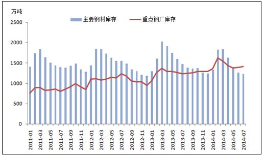 目前,中國鋼材市場正處于去庫存時(shí)期,主要鋼材的庫存量正在快速減少。據(jù)我的鋼鐵數(shù)據(jù)庫顯示截止2014年8月8日,中國主要鋼材庫存量為1190.35萬噸,與去年相比下降202萬噸,同比降幅為14.5%。3月至7月的平均降速達(dá)到9.62%,已大幅度超過以往的去庫存速度。庫存量的快速下降,一般意味著下游行業(yè)對鋼材需求的增加,鋼材市場的情況理應(yīng)十分良好,但實(shí)際上鋼材的價(jià)格卻是不增反降。據(jù)悉,中國7月的Myspic普鋼絕對價(jià)格指數(shù)為3393.54元/噸,同比下降8.56%。