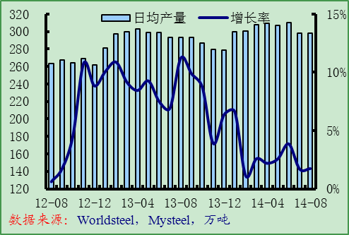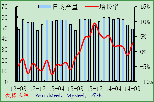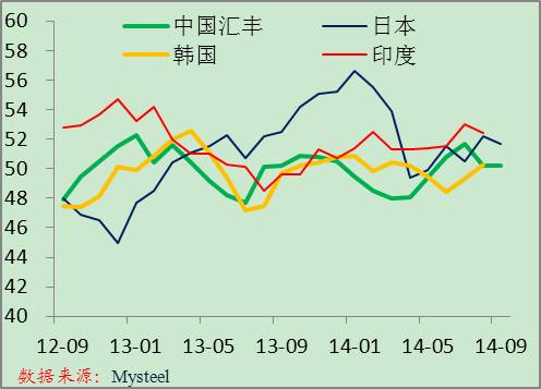 8月份亞洲粗鋼日均產(chǎn)量達(dá)到298.4噸,環(huán)比增長0.1%,同比增長1.7%,韓國和印度產(chǎn)量增長明顯。根據(jù)中鋼協(xié)的統(tǒng)計,9月份中國重點鋼企粗鋼日均產(chǎn)量環(huán)比小幅下降,而Mysteel調(diào)查的9月份全國鋼鐵PMI產(chǎn)出指數(shù)也有所下降。預(yù)計9月份亞洲粗鋼日均產(chǎn)量將環(huán)比下降。