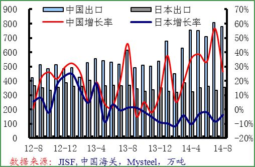 8月份中國鋼材出口778萬噸,同比增長26.4%,環(huán)比下降3.7%。9月份中國鋼材市場大幅下滑,鋼材出口進(jìn)一步增強,PMI調(diào)查也顯示出口訂單增長,預(yù)計9月份中國鋼材出口依然保持在高水平。8月日本鋼鐵出口量為356萬噸,同比下降3.8%,環(huán)比增長6.7%,主要是日元貶值帶動。9月份日元大幅貶值,日本鋼材出口競爭力再次加強,預(yù)計出口量將繼續(xù)環(huán)比增長。