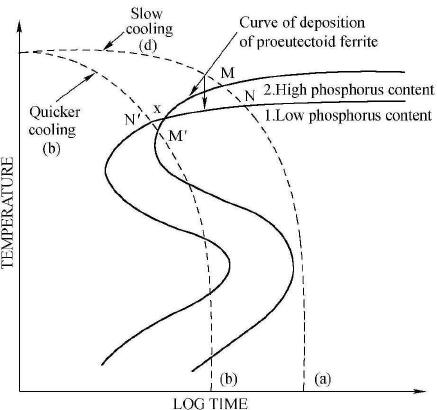 上圖曲線1、2分別是高P鋼、低P鋼的恒溫轉(zhuǎn)變曲線,也可以分別表示同一鋼中高P區(qū)和低P區(qū)的恒溫轉(zhuǎn)變曲線。在控制冷卻速率較慢的情況下,如曲線(a)所示,鐵素體將會先在M點形核。因為P能夠提高C的活度系數(shù),所以高P區(qū)域C的活度較高,但實際濃度卻偏低,鐵素體的形核時會推動C元素向低P區(qū)域、原本C濃度高(活度低)的區(qū)域擴散,這樣就會造成C元素偏聚,形成帶狀組織;如果冷卻速率較快,如(b)所示,鐵素體會先在Nˊ點(低P區(qū))形核,促進C元素向高P區(qū)域、原來C濃度較低的區(qū)域擴散,會使C分布的更加均勻,鐵素體和珠光體都會隨機形核長大,減弱或抑制帶狀組織形成。