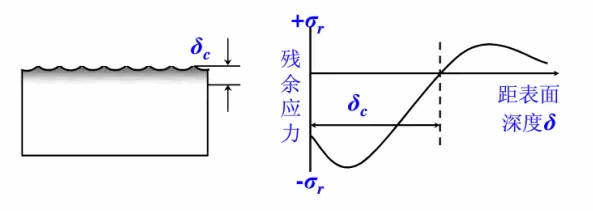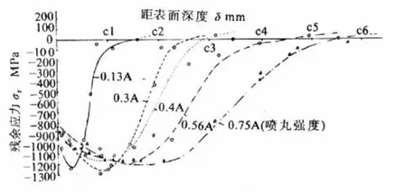 噴丸強(qiáng)化影響工件表面深度取決于工作自身強(qiáng)度,工件自身強(qiáng)度越高,影響深度越小。通常影響深度為0.1-0.8mm。下圖是高強(qiáng)鋼(σb=1900MPa)噴丸殘余應(yīng)力分布曲線,圖中可見噴丸強(qiáng)度由0.13Amm增高至0.75Amm,導(dǎo)致δc由0.15mm增至0.55mm,但表面殘余應(yīng)力和最大殘余應(yīng)力變化不明顯。