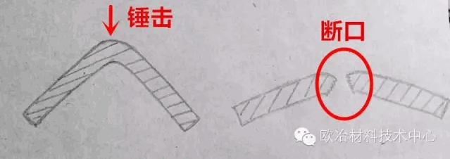 如:熱軋板可以將板材折彎90度,在彎角處大力錘擊,觀察斷后裂口形貌。