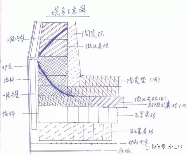 爐缸炭磚上、下層砌筑和門磚在圓周同一方向,導致上下層磚縫聯通,形成貫穿縫,很容易鐵水侵入。