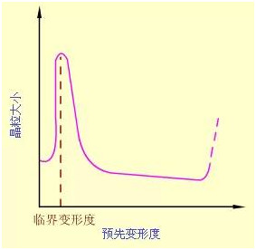 (2)預(yù)先變形度 變形度的影響主要與金屬變形的均勻度有關(guān)。變形越不均勻, 再結(jié)晶退火后的晶粒越大。變形度很小時(shí),因不足以引起再結(jié)晶,晶粒不變。當(dāng)變形度達(dá)到2~10%時(shí),金屬中少數(shù)晶粒變形,變形分布很不均勻,所以再結(jié)晶時(shí)生成的晶核少,晶粒大小相差極大,非常有利于晶粒發(fā)生吞并過程而很快長大,結(jié)果得到極粗大的晶粒。使晶粒發(fā)生異常長大的變形度稱作臨界變形度。生產(chǎn)上應(yīng)盡量避免在臨界變形度范圍內(nèi)的塑性變形加工。超過臨界變形度之后,隨變形度的增大,晶粒的變形更加強(qiáng)烈和均勻,再結(jié)晶核心越來越多,因此再結(jié)晶后的晶粒越來越細(xì)小。但是當(dāng)變形度過大(約≥90%)時(shí), 晶??赡茉俅纬霈F(xiàn)異常長大,一般認(rèn)為它是由形變織構(gòu)造成的。