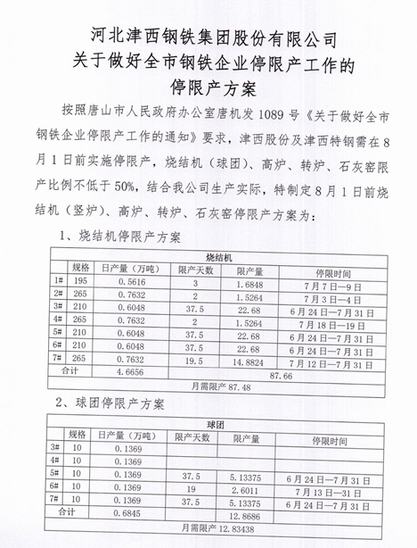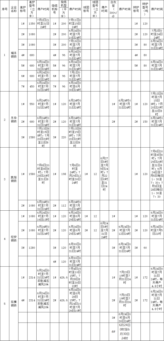 2、132平米燒結機、14平米豎爐、轉爐和白灰窯限產(chǎn)50%。6月25日0時—7月14日0時停產(chǎn),7月14日0時—7月31日正常生產(chǎn),共停機19天。