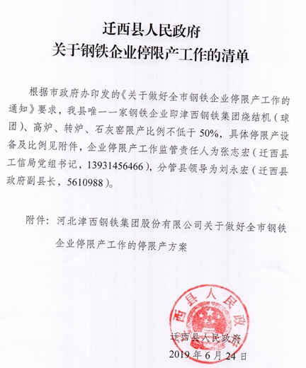唐山遷西縣人民政府關于鋼鐵企業(yè)停限產(chǎn)工作的清單