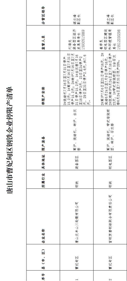 唐山市豐南區(qū)鋼鐵企業(yè)停限產(chǎn)清單