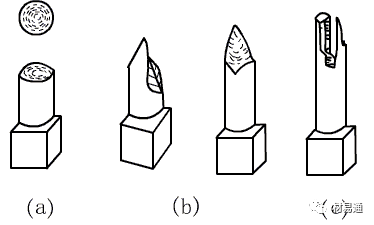 塑性材料斷口與試件的軸線垂直,斷口平整并有回旋狀塑性變形痕跡(圖a),這是由切應力造成的切斷;