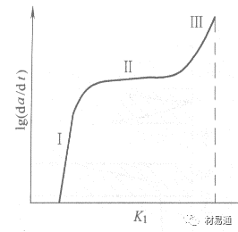 II區(qū):da/dt與K1無(wú)關(guān),通常說(shuō)的裂紋擴(kuò)展速率就是指該區(qū)速率,因?yàn)樗饕呻娀瘜W(xué)過(guò)程控制,較強(qiáng)烈地依賴于溶液的pH值,粘度和溫度;