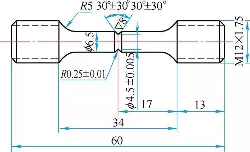 第三,試樣的制造。按圖沿材料的順纖維方向加工試樣,粗加工后熱處理至所要求的抗拉強度,然后精加工至規(guī)定尺寸,缺口用中軟細粒氧化鋁砂輪磨制。磨削時應(yīng)保證缺口根部半徑圓滑。磨削后投影檢查,確保缺口尺寸符合圖紙要求。逐根測量缺口根部直徑(圖中為φ4.5±0.05mm)的尺寸,并做好編號記錄。