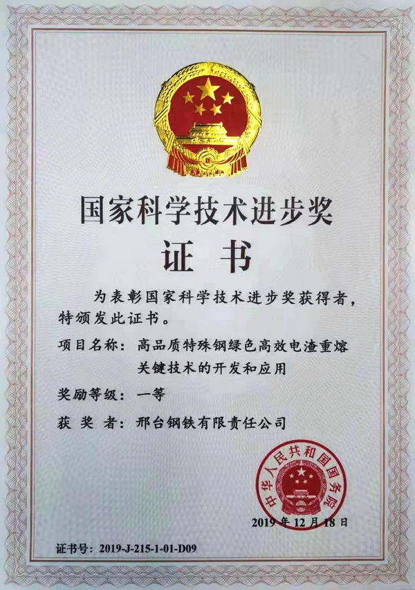 The State Science and Technology Progress Award is one of three state-level science and technology awards established by the State Council, which also include the State Natural Science Award and the State Technological Innovation Award.There is a review each year. The projects which won the first prize are 15% of the whole winning projects. This year, only 22 projects won the first prize of National Science & Technology Progress Award. The project of “Development and application of the key technology of green and efficient electroslag remelting of high-qualityspecial steel” which is jointly participated by Xingtai Steel won the prize. As the principal head, Doctor Jiangfang also won the first prize of individual award.