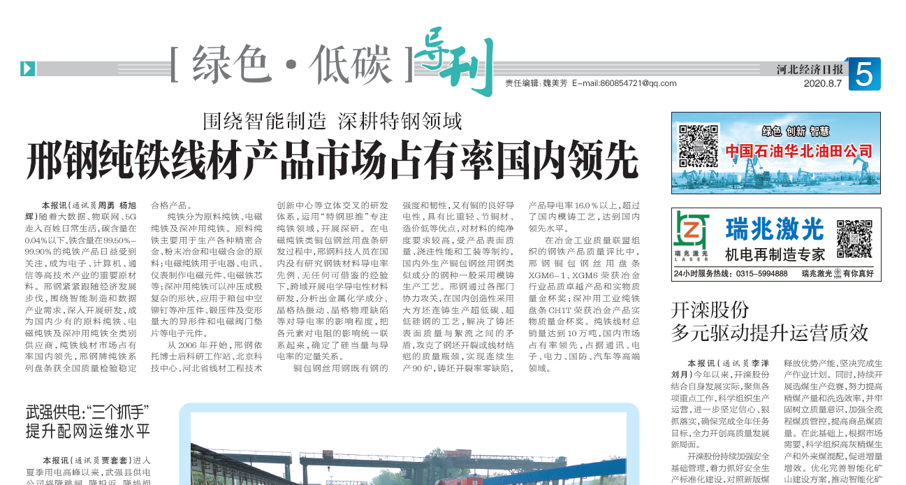 本報(bào)訊(通訊員周勇 楊旭輝)隨著大數(shù)據(jù)、物聯(lián)網(wǎng)、5G走入日常生活,碳含量在0.04%以下、鐵含量在99.50%-99.90%的純鐵產(chǎn)品日益受到關(guān)注,成為電子、計(jì)算機(jī)、通信等高技術(shù)產(chǎn)業(yè)的重要原材料。邢鋼緊緊跟隨我國(guó)經(jīng)濟(jì)發(fā)展步伐,圍繞智能制造和數(shù)據(jù)產(chǎn)業(yè)需求,深入開展研發(fā),成為國(guó)內(nèi)少有的原料純鐵、電磁純鐵及深沖用純鐵全類別供應(yīng)商,純鐵線材市場(chǎng)占有率國(guó)內(nèi)領(lǐng)先,邢鋼牌純鐵系列盤條獲全國(guó)質(zhì)量檢驗(yàn)穩(wěn)定合格產(chǎn)品。