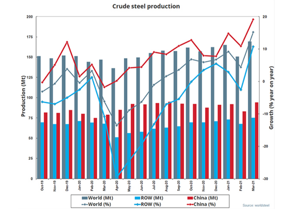 2021年第一季度全球粗鋼產(chǎn)量為4.869億噸,同比提高10.0%;