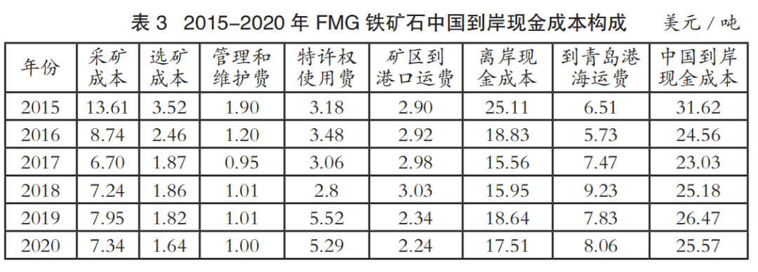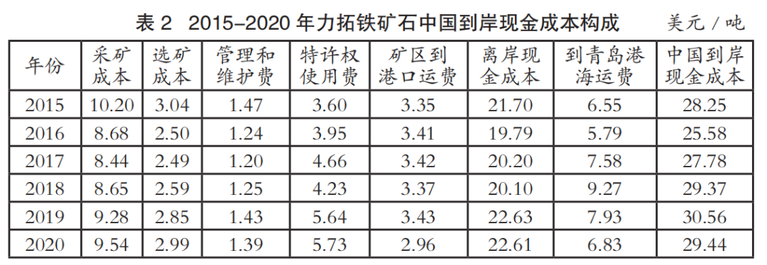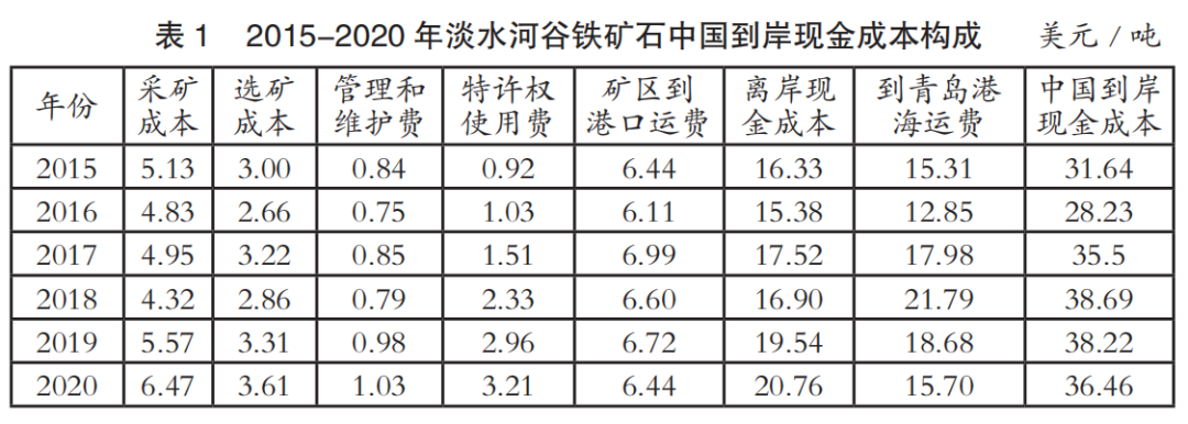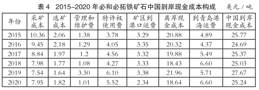 中國進口鐵礦石到岸成本主要由離岸現(xiàn)金成本和海運成本兩部分構成。表1至表4為2015-2020年國際四大礦鐵礦石中國到岸現(xiàn)金成本構成情況(數據來源:AME),其中離岸現(xiàn)金成本由采礦成本、選礦成本、管理和維護費、特許權使用費和礦區(qū)到港口運費構成;中國到岸現(xiàn)金成本由離岸現(xiàn)金成本和到青島港海運費構成;該成本數據僅為現(xiàn)金成本,不含國際四大礦的融資、折舊費用。