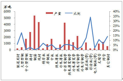 1-5月份,我國共出口鋼材1791.7萬噸,棒線材、角型材、板材、鋼管、鐵道用材和其它用材分別占11.4%、5.9%、60.1%、15.4%、1.0%和6.2%,板材所占份額最大,棒線材和鋼管次之。就前5個月出口量而言,退稅取消的鋼材品種出口數(shù)量為703.3萬噸,占1-5月份鋼材出口總量的39.3%。雖然鋼材總出口量只占到國內(nèi)產(chǎn)量的5.1%,但仍有部分品種出口占產(chǎn)量的比例較大,對出口具有一定依賴性。鍍鋅板、熱軋板卷、中厚板和大型型鋼的出口數(shù)量占產(chǎn)量的比例較大,在出口稅率下調(diào)的情況下,國內(nèi)資源供應(yīng)的壓力將會明顯增大,從而影響到國內(nèi)價格的運行。不過,在政策執(zhí)行日期之前,出口企業(yè)必定要加緊落實前期簽訂的合同,熱軋卷等品種的出口可能會加大,對國內(nèi)鋼材市場將是利好。
