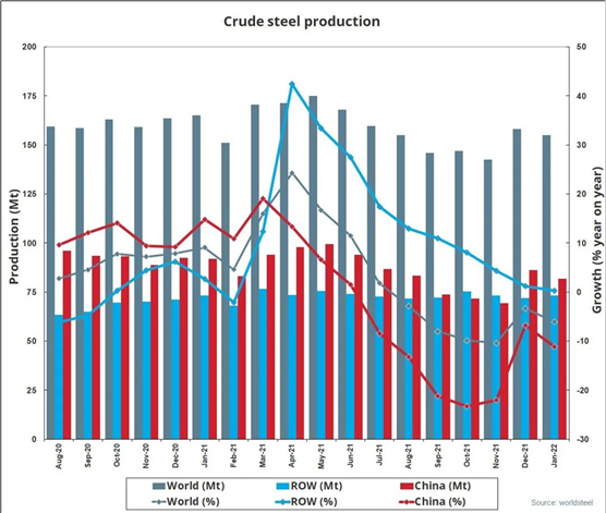2022年1月全球64個納入世界鋼鐵協(xié)會統(tǒng)計國家的粗鋼產(chǎn)量為1.550億噸,同比下降6.1%。