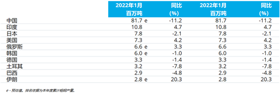 2022年1月粗鋼產(chǎn)量累計前十位的國家
