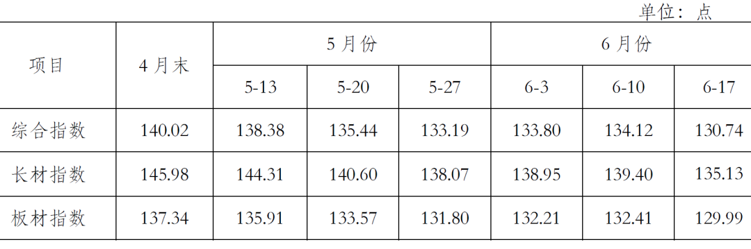 5月末,CSPI長材指數(shù)為138.07點,環(huán)比下降7.91點,降幅為5.42%;CSPI板材指數(shù)為131.80點,環(huán)比下降5.54點,降幅為4.03%。與上年同期相比,長材、板材指數(shù)分別下降9.58點和11.48點,降幅分別為6.49%和8.01%。(見下表)