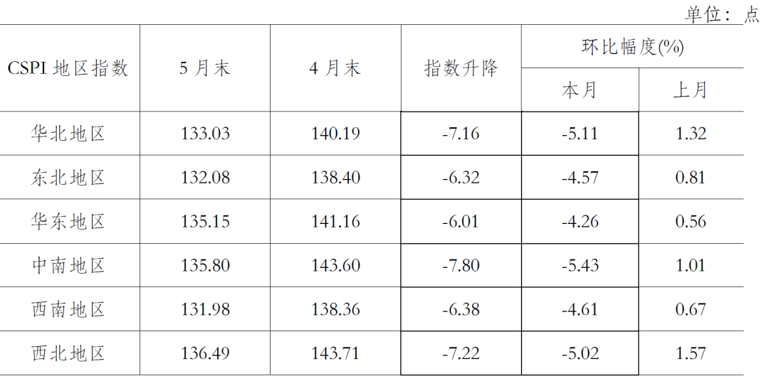 5月份,CSPI全國六大地區(qū)鋼材價格指數(shù)均由升轉(zhuǎn)降。其中中南地區(qū)降幅較大,環(huán)比下降5.43%;華東地區(qū)降幅較小,環(huán)比下降4.26%;華北、東北、西南和西北地區(qū)鋼價指數(shù)環(huán)比分別下降5.11%、4.57%、4.61%和5.02%。(見下表)