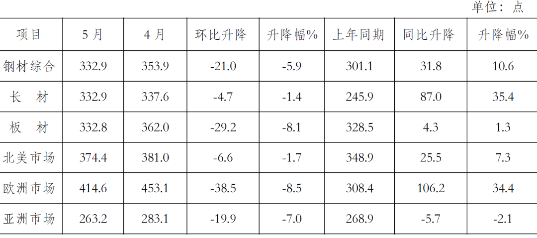5月份,CRU國際鋼材價格指數(shù)為332.9點,環(huán)比下降21.0點,降幅為5.9%;同比上升31.8點,升幅為10.6%。(見下圖)
