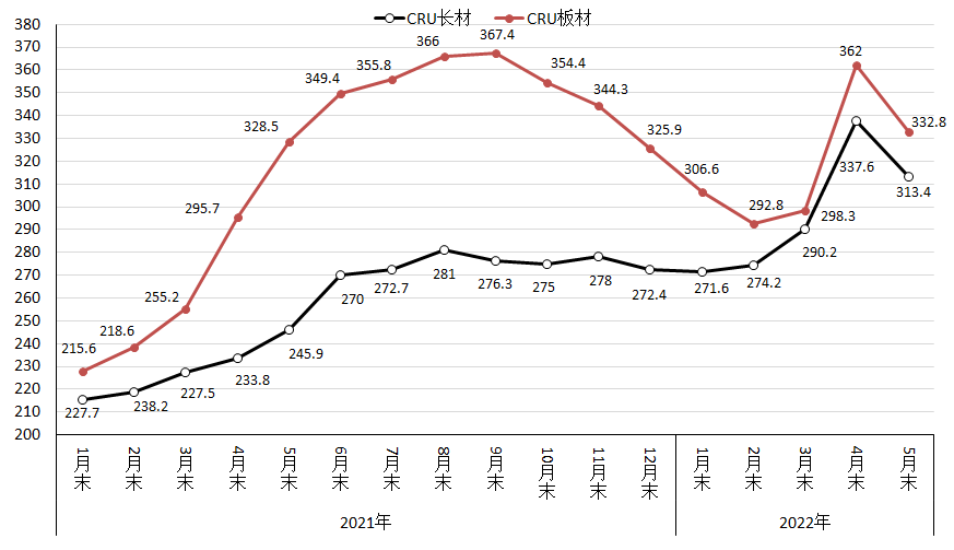 5月份,CRU長材指數(shù)為313.4點,環(huán)比下降4.7點,降幅為1.4%;CRU板材指數(shù)為332.8點,環(huán)比下降29.2點,降幅為8.1%,比長材降幅高2.2個百分點;與去年同期相比,CRU長材指數(shù)同比上升87.0點,升幅為35.4%;CRU板材指數(shù)同比上升4.3點,升幅為1.3%。(見下圖)