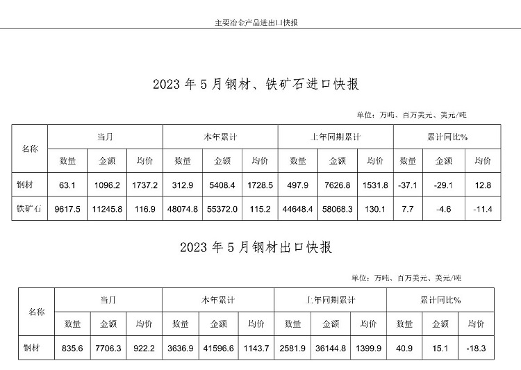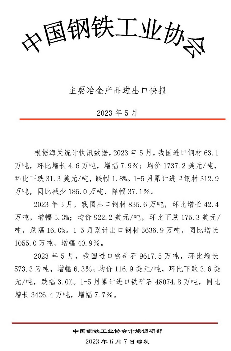 中鋼協(xié):5月主要冶金產(chǎn)品進(jìn)出口快報(bào)