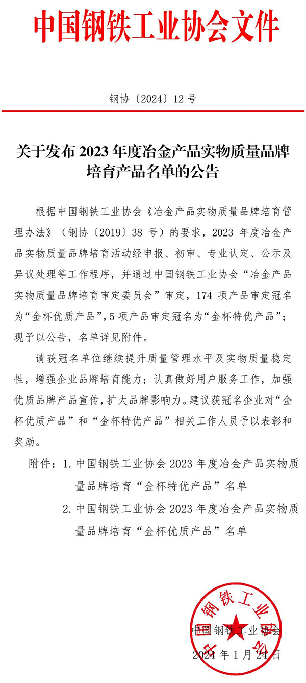 冶金產(chǎn)品實(shí)物質(zhì)量品牌培育產(chǎn)品認(rèn)定活動(dòng),是中鋼協(xié)在鋼鐵行業(yè)組織開展的認(rèn)定評(píng)價(jià)活動(dòng),也是國(guó)內(nèi)唯一一項(xiàng)針對(duì)鋼鐵行業(yè)實(shí)物產(chǎn)品質(zhì)量進(jìn)行認(rèn)定的評(píng)價(jià)活動(dòng)。旨在評(píng)選行業(yè)標(biāo)桿產(chǎn)品,擴(kuò)大中國(guó)鋼鐵行業(yè)優(yōu)秀產(chǎn)品影響力及占有率,提升產(chǎn)品品牌價(jià)值與口碑。通過的產(chǎn)品,不僅代表了產(chǎn)品質(zhì)量的穩(wěn)定性和先進(jìn)性,更反映了企業(yè)管理的卓越性,是得到行業(yè)內(nèi)專家、同行和客戶都認(rèn)可的優(yōu)秀產(chǎn)品,對(duì)增加產(chǎn)品銷量、提高產(chǎn)品品牌起著重要的作用,是一種無(wú)形價(jià)值和財(cái)富。