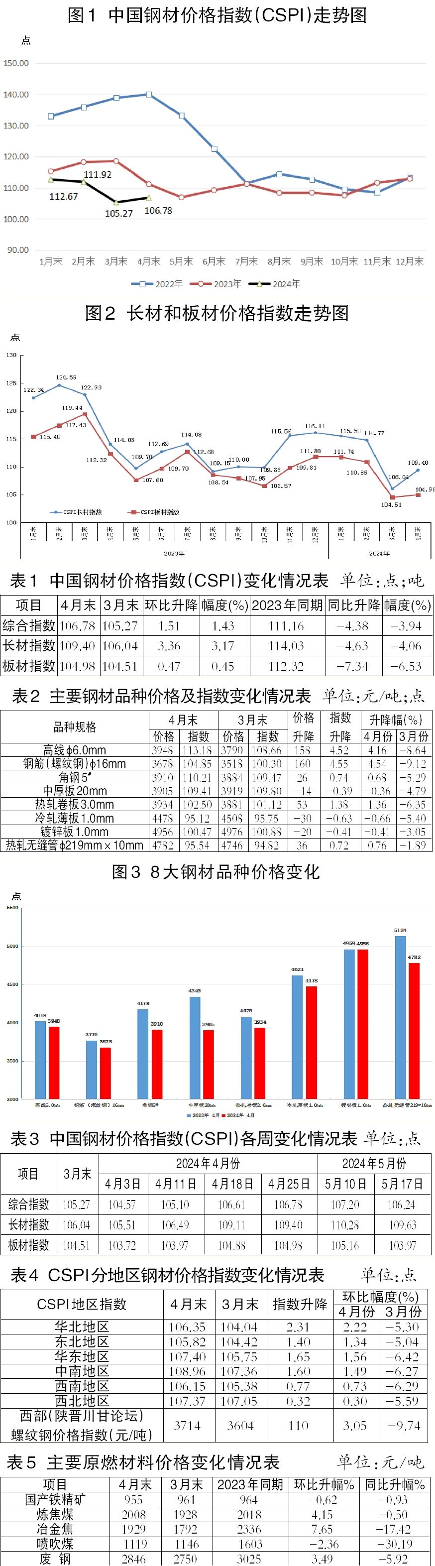 據(jù)中國(guó)鋼鐵工業(yè)協(xié)會(huì)監(jiān)測(cè),截至4月末,中國(guó)鋼材價(jià)格指數(shù)(CSPI)為106.78點(diǎn),環(huán)比回升1.51點(diǎn),升幅為1.43%;比上年末下降6.12點(diǎn),降幅為5.42%;同比下降4.38點(diǎn),降幅為3.94%。