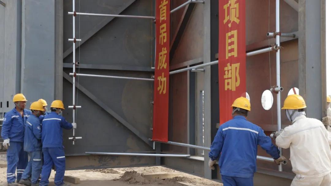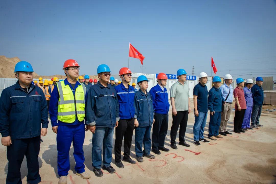 在激情似火的項目施工現(xiàn)場,公司董事長張育明、總經(jīng)理彭世丹、副總經(jīng)理馬保良、柳萬超、韓清連等及監(jiān)理公司代表和現(xiàn)場施工隊伍,共同見證了制氧工程的空分設備安裝。