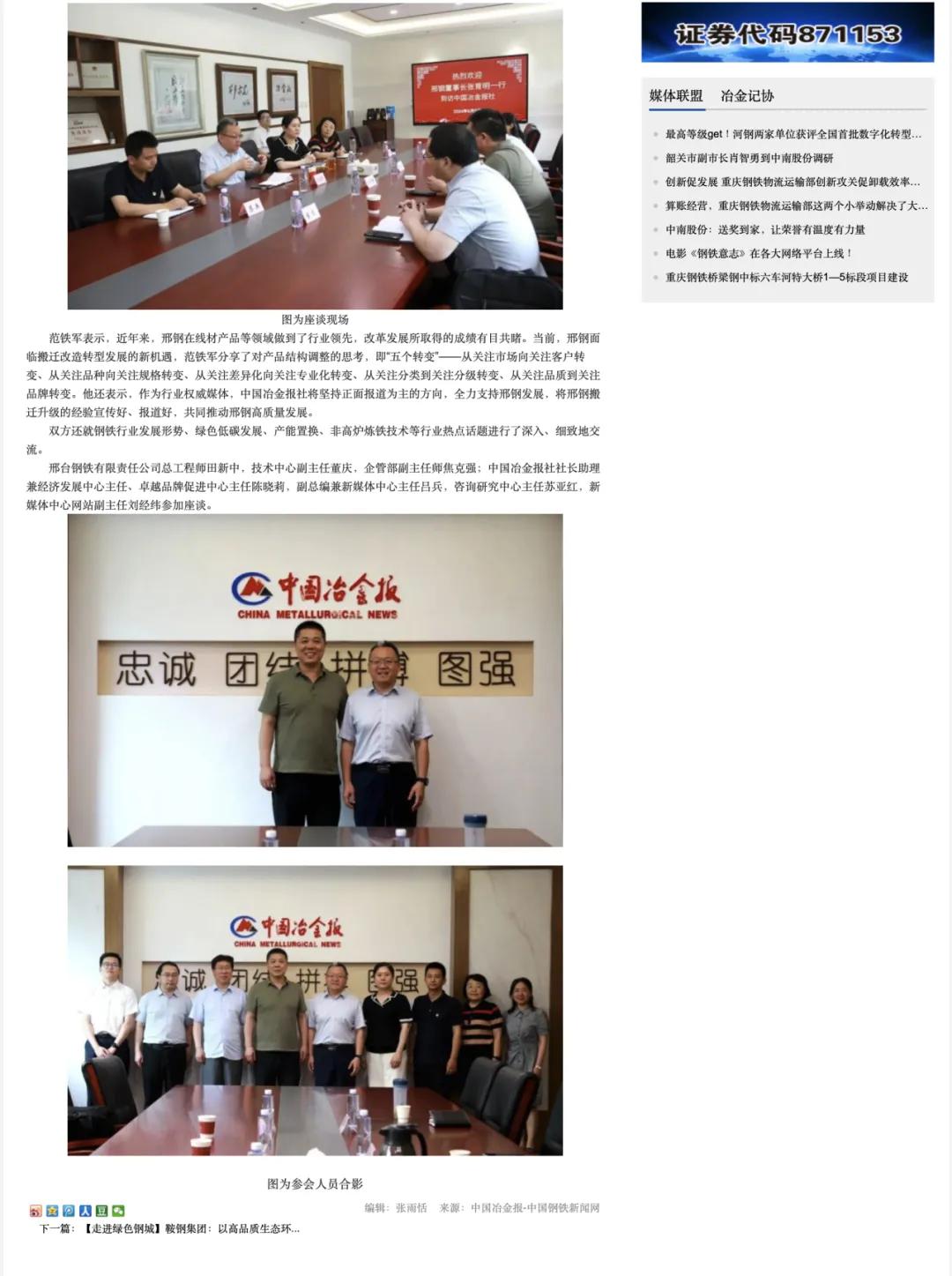 邢臺鋼鐵有限責(zé)任公司總工程師田新中,技術(shù)中心副主任董慶,企管部副主任師焦克強;中國冶金報社社長助理兼經(jīng)濟發(fā)展中心主任、卓越品牌促進中心主任陳曉莉,副總編兼新媒體中心主任呂兵,咨詢研究中心主任蘇亞紅,新媒體中心網(wǎng)站副主任劉經(jīng)緯參加座談。
