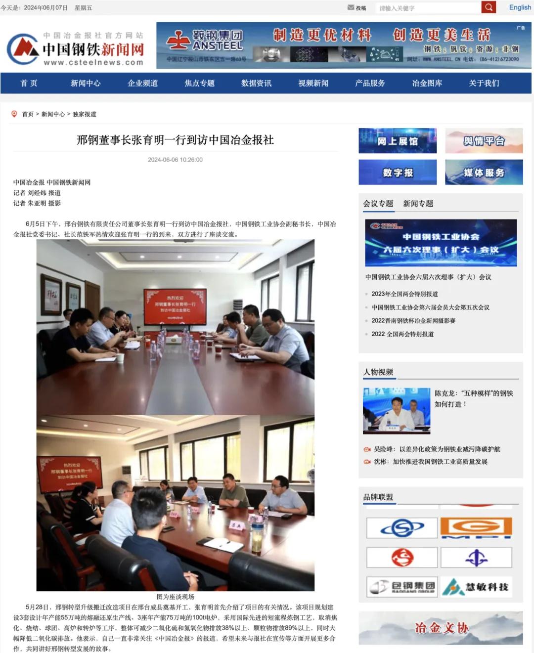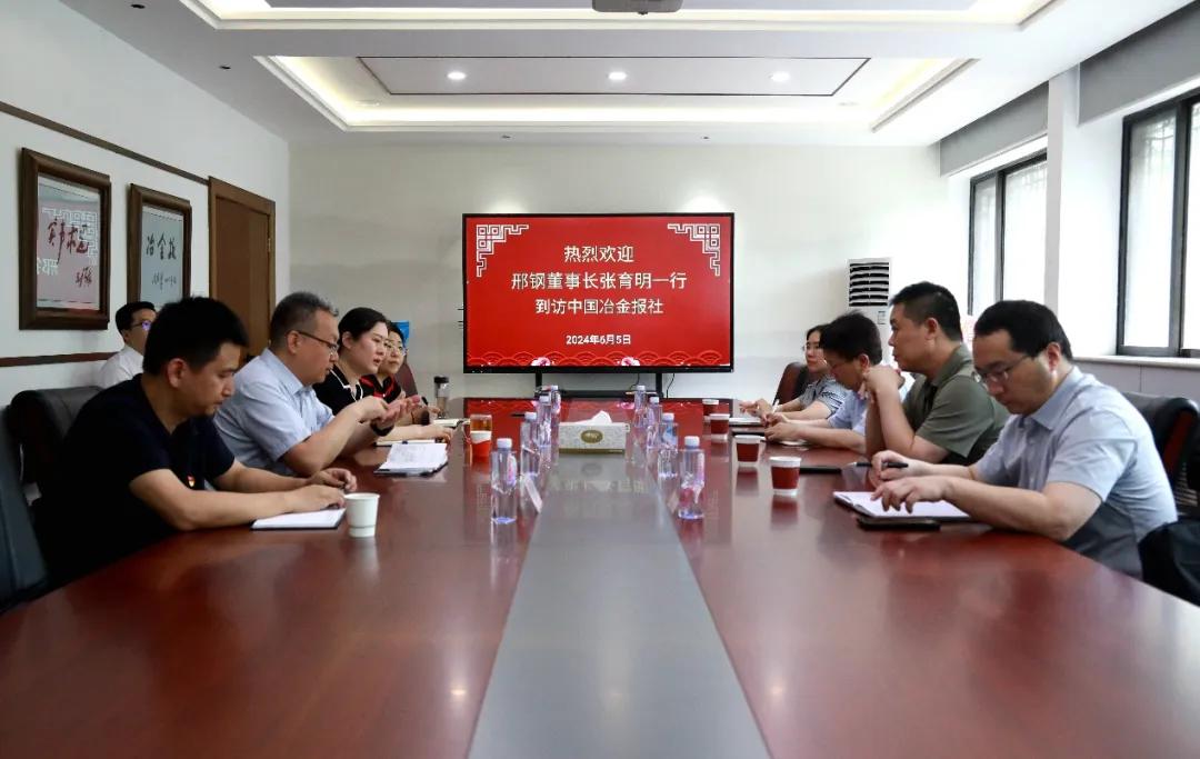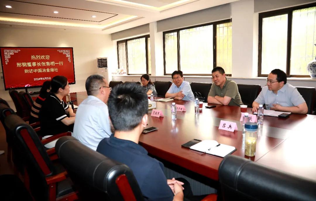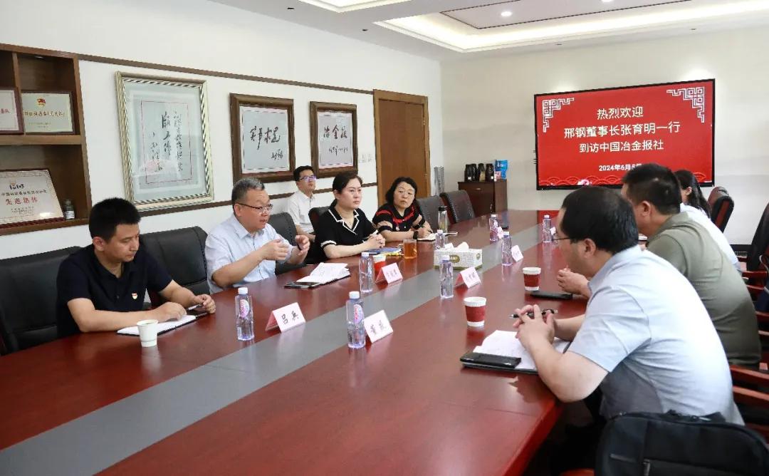 6月5日下午,邢臺鋼鐵有限責(zé)任公司董事長張育明一行到訪中國冶金報社,中國鋼鐵工業(yè)協(xié)會副秘書長,中國冶金報社黨委書記、社長范鐵軍熱情歡迎張育明一行的到來,雙方進行了座談交流。